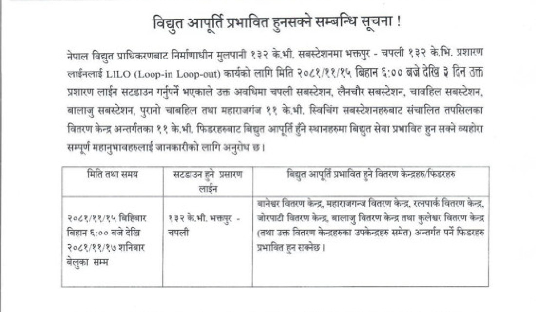 नेपाल विद्युत् प्राधिकरणले काठमाडौं उपत्यका पश्चिम वितरण प्रणाली सदृढीकरण आयोजना खरिपाटी, भक्तपुरका अनुसार बिहीबारदेखि विभिन्न ठाउँमा विद्युत् आपूर्ति अवरुद्ध हुने जानकारी दिएको छ ।