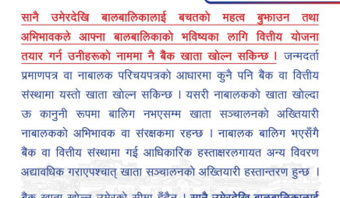 सानै उमेरदेखि बालबालिकालाई बचतको महत्व बुझाउन तथा अभिभावकले आफ्ना बालबालिकाको भविष्यका लागि वित्तीय योजना तयार गर्न उनीहरुको नाममा नै बैंक खाता खोल्न सकिने केन्द्रीय बैंकले जनाएको छ। ‘जन्मदर्ता प्रमाणपत्र वा नाबालक परिचयपत्रको आधारमा कुनै पनि बैंक वा वित्तीय संस्थामा यस्तो खाता खोल्न सकिन्छ’, सूचनामा भनिएको छ, ‘यसरी नाबालकको खाता खोल्दा ऊ कानुनी रुपमा बालिग नभएसम्म खाता सञ्चालनको अख्तियारी नाबालकको अभिभावक वा संरक्षकमा रहन्छ ।’