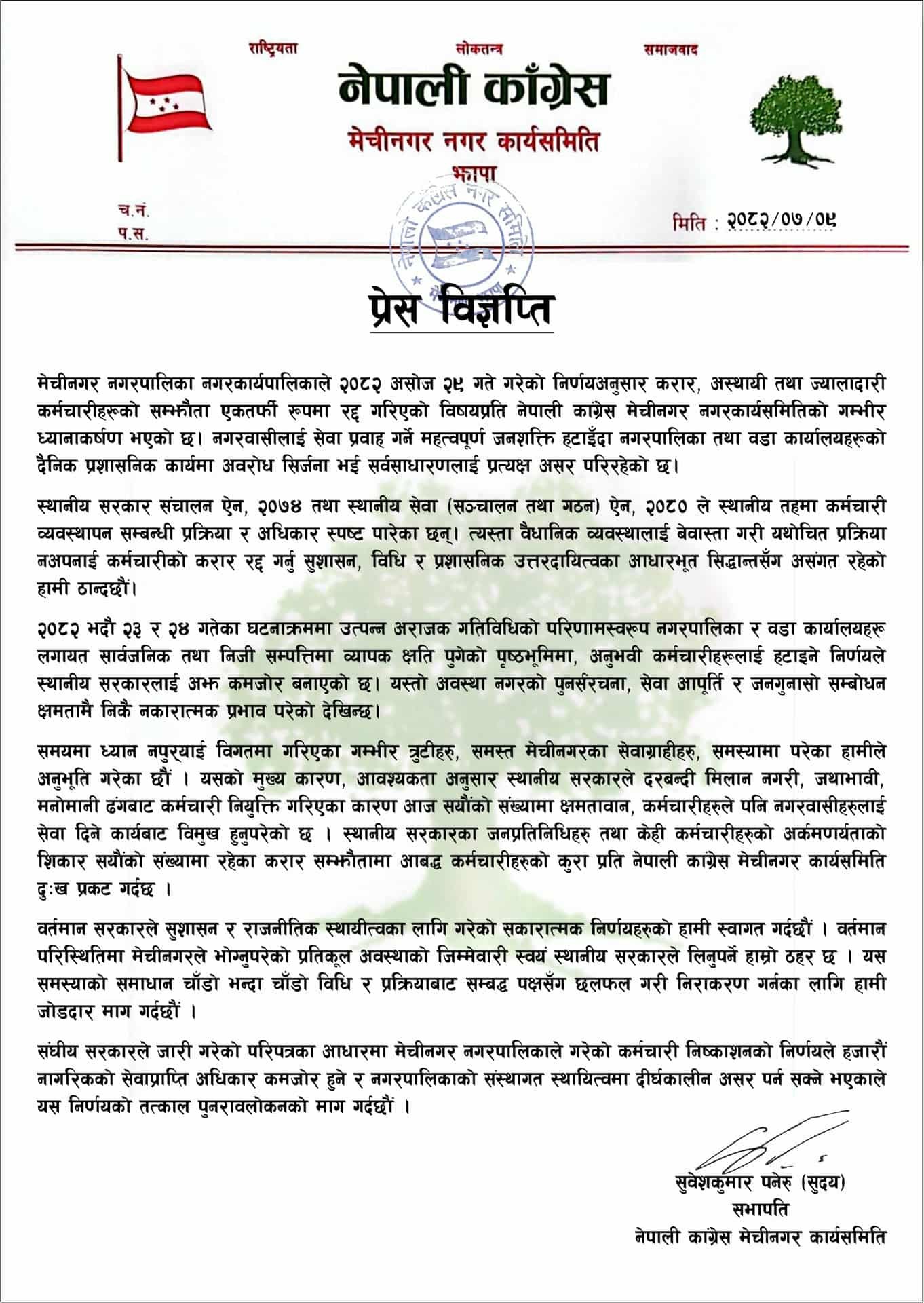 पार्टीका मेचीनगर सभापति सुवेशकुमार पनेरु (सुदय)ले आज प्रेस विज्ञप्ति जारी गर्दै कर्मचारी निष्काशनको निर्णयले हजारौं नागरिकको सेवा पाउने अधिकार कमजोर हुने र नगरपालिकाको संस्थागत स्थायित्वमा दीर्घकालीन असर पर्न सक्ने भएकाले तत्काल निर्णय पुनरावलोकन गर्न माग गर्नु भएको छ ।