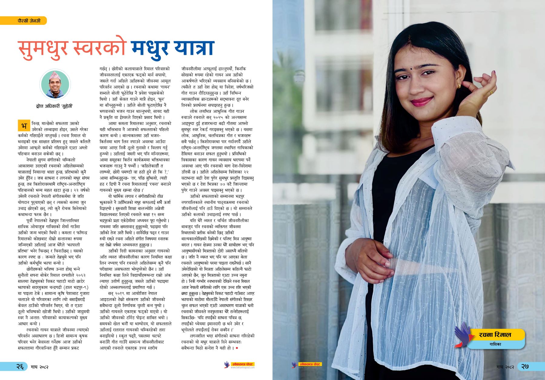 नेपाली सुगम संगीतको चम्किलो आकाशमा उदाएकी रचनाको अहिलेसम्मको यात्रालाई नियाल्दा थाहा हुन्छ, प्रतिभाको कुनै उमेर हुँदैन । जब साधना र लगनको मधुर संगम हुन्छ, तब किशोरावस्थामै राष्ट्रिय–अन्तर्राष्ट्रिय पहिचानको भव्य महल खडा हुन्छ । २३ वर्षको उमेरमै रचनाले नेपाली संगीतकर्ममा जे जति योगदान पुर्याएकी छन् र त्यसको बलमा जुन उचाइ छोएकी छन्, त्यो कुनै रोचक सिनेमाको कथाभन्दा फरक छैन ।