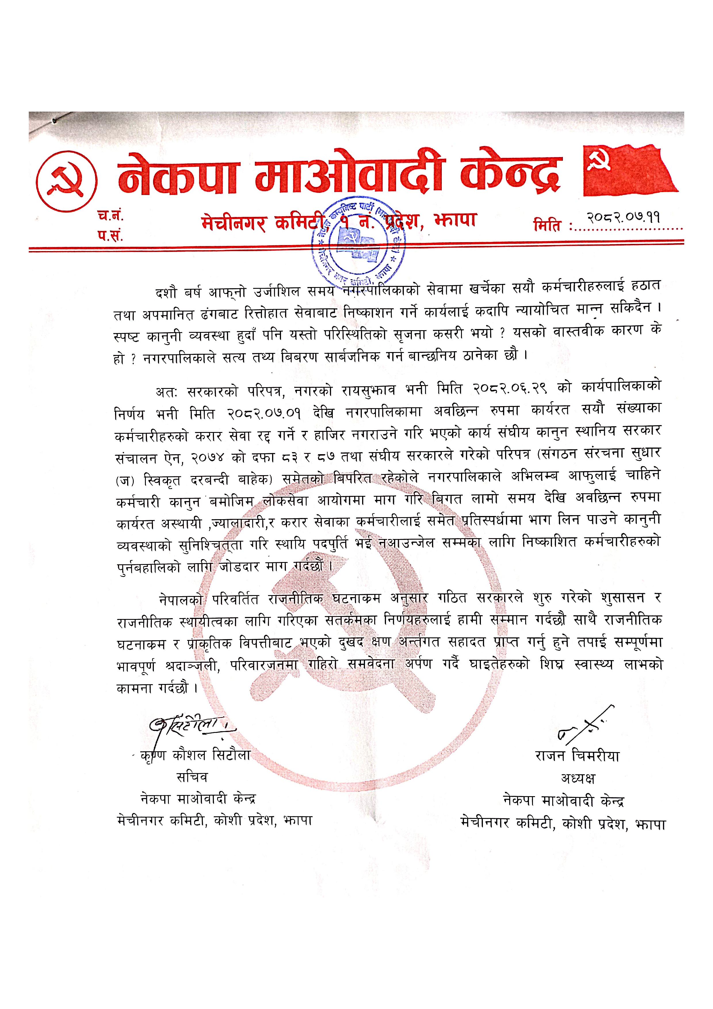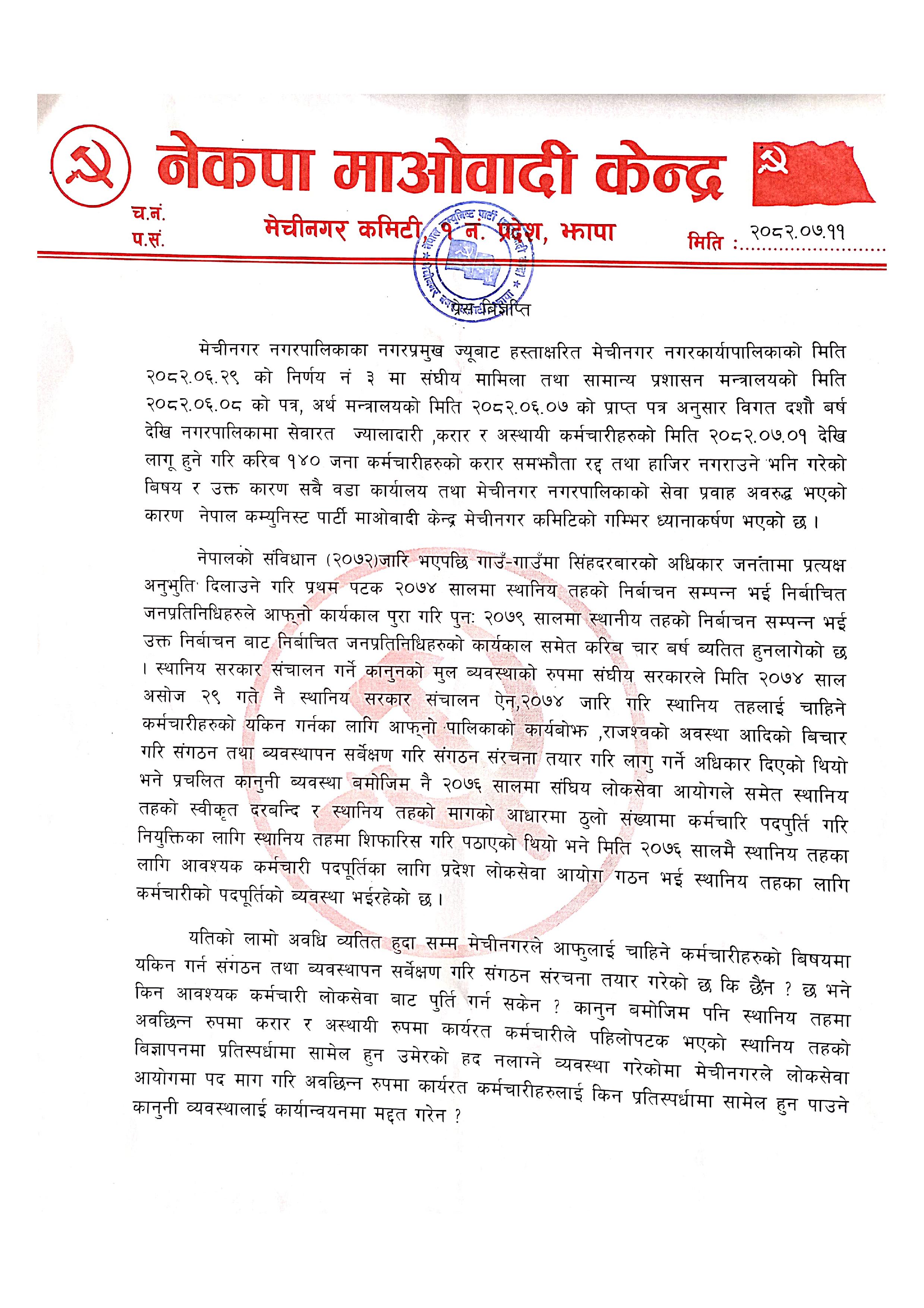 झापा, ११ कात्तिक । नेकपा माओबादी केन्द्र मेचीनगरले स्थायी पदपूर्तिको व्यवस्था नहुञ्जेलसम्मका लागि निष्काशनमा परेका कर्मचारीहरुलाई नै पुनर्वहाली गर्न माग गरेको छ ।